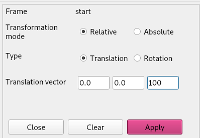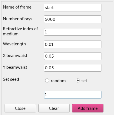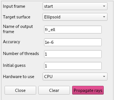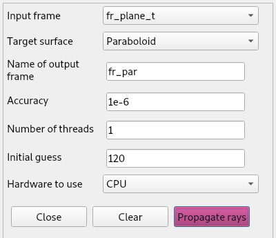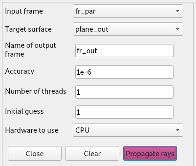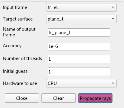 In the Ray-tracer menu we select Propagate rays and we perform the following propagations. Note that each propagation generates a new frame. To be able to select this frame as input frame for a next propagation, we have to reopen the form from the menu bar.