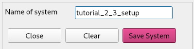 We will save this system now, to demonstrate how this works. We can do so from the systems menu > save system. A form will show up allowing us to give a name to the saved file.