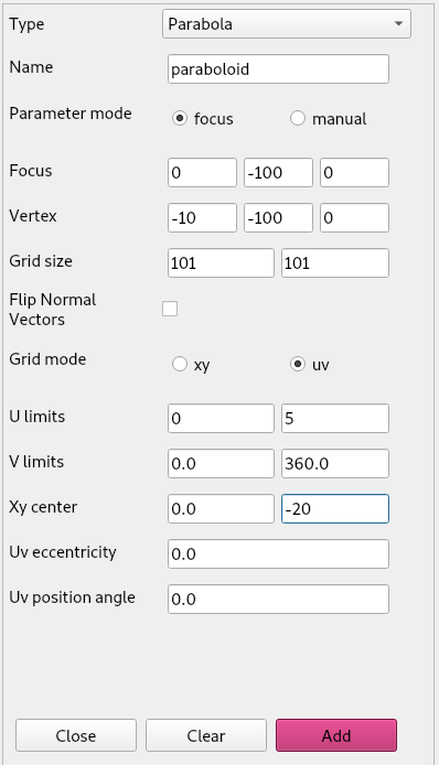 In the previous tutorial we built a simple optical system consisting of one paraboloid. We then performed a ray-trace from the initial frame of rays, defined in the aperture of the paraboloid, to the paraboloid surface, and from the paraboloid we found the focus of the frame by using the focus finder. We did all of this using the tubular ray-trace frame input.